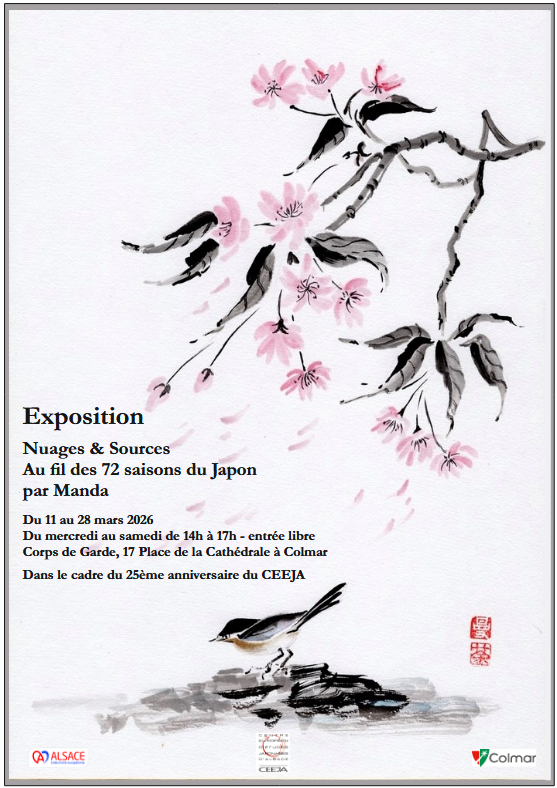 En avril, à l’occasion de la commémoration de la mort du poète japonais Ozaki Hôsai, la ville de Tonoshô à Shôdoshima exposera les sumi-e originaux du livre de Manda « Ozaki Hôsai, haikus du Bout du Monde » paru chez Synchronique Editions. L’exposition à la Sky Gallery (à ciel ouvert), dans les rues labyrinthiques (maze town) que le poète a parcouru durant les derniers mois de sa vie, permettra au public de découvrir les haiga et calligraphies qui illustrent les derniers haïkus de l’auteur composés à Shôdoshima.